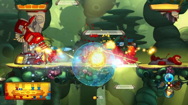 The game offers both online and split-screen matches and also lets up to three local players take on another team online. Matches consist of two teams of three trying to take down their enemy’s base while also defending theirs from attack. Each team has its own set of powerful turrets that also provide barriers for the other team, so once these turrets are down, the opposing team can easily waltz into an enemy base and take it down. Each team is also assisted by friendly bots that are constantly making their way to each turret, but without the help of the Awesomenauts, they will quickly get shot down.