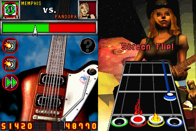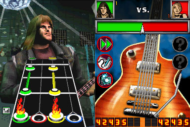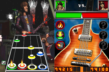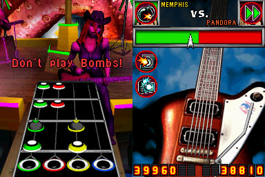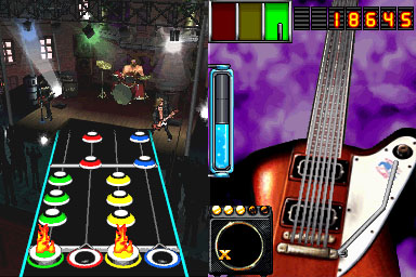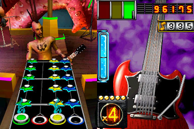 Personally, I‚ would like to‚ see a more minimalist display on the top screen, with just the keys you need to play, allowing them to be bigger and easier to see. Seeing the virtual character on stage isn’t needed for a DS game. Guitar Hero On Tour should model itself on many of the best DS games, which use minimalistic graphics.