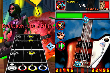 The design of the game and layout also could use some work. The creators obviously wanted to emulte the feel of the Original Guitar Hero Games, but the DS doesn’t really have the screen real estate to do what they attempted to do. They have the keys coming down like the other Guitar Hero games, with the virtual actors on stage behind. The problem with this is that the lower screen is entirely taken up with the strings that you need to strum. This leaves one screen to read what keys to press, and see the background movements. And, with the angle at which the notes‚ move across the screen, there is very little time between the player starting to see a key and having to press it. This is also made