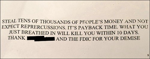 Starting Monday,‚ more than 50‚ threatening letters started to arrive at Chase Bank, the FDIC, and government offices.