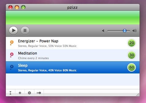 Pzizz is basically a white noise generator. However, instead of making static noise or repetitive nature noises (you know, the squawking birds in nature sounds or the babbling brook), the program generates soundtracks filled with a varying combination of ambient sounds with soothing voice over giving you gentle instructions. Everything about the soundtracks is engineered to help you disconnect from your surroundings and maximally relax you. Sounds range from chimes and synthesized notes, string instrument harmonies, and even a few of those nature noises. None of the sounds are overtly displeasing or annoying, though you’ll probably grow to like some sounds more than others. One of the coolest effects I noticed was a string orchestra gradually crescendo-ing in the background as the voice over started to tell me to prepare to wake up from my nap.
