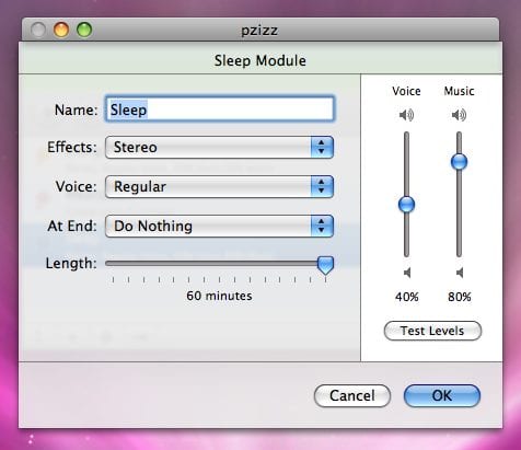 The software comes with three modules: sleep, energize, and meditate. The sleep module is, aptly enough, for helping you to fall into a deep sleep. The energize module builds shorter programs meant to guide you through a power nap, complete with a beeping alarm at the end of the track should you not arouse and the end of the allotted time. The meditate module is silent, save for a single chime at minute intervals of your choosing. The volume of the music and voiceover are customizable depending on your tastes, which is nice for anyone who dislikes the voice over, as well as the length of the tracks.