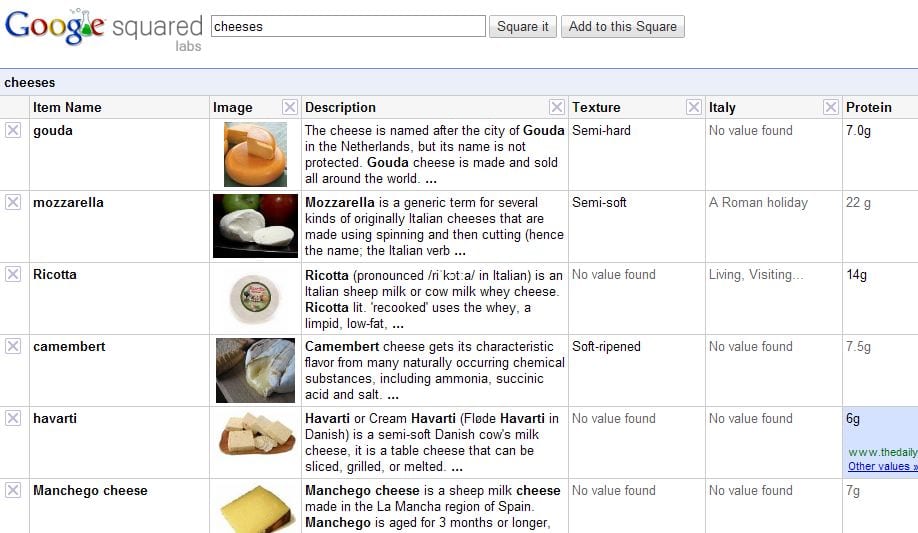 But Google is never one to be left out “" remember that time they’re went head to head with Amazon by selling e-books? “" and today they released Google Squared, which produces your results in a spreadsheet format. Spending a few minutes with it, you’ll quickly realize it’s nowhere near as powerful as Wolfram Alpha, but it has potential. For example, the Google square for the Sox lists how the players bat and throw, along with some images. You can add a category to the results as well from the suggestions (Pedroia only makes $500k a year?), or try picking a totally new one on your own. The pages for cheeses and planets are equally informative.