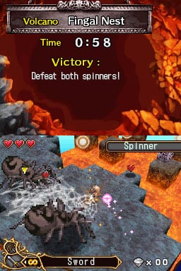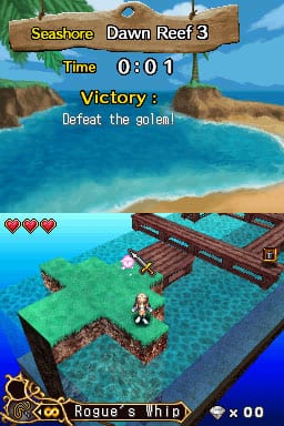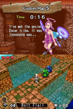 Most stages require you to complete a stated objective “" normally, defeat all enemies “" and to also bring a key dropped by the final enemy to a locked box in the stage. There is no time limit, although beating a stage within certain times earns you gold, silver and bronze medals. Gems are also scattered throughout stages and dropped by defeated enemies, which are used to pay down Anise’s debt in town and to buy items for your own maps in the Create-A-Map mode.