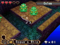 The second issue is the slippery play control. Movement is much easier with the control pad, but vaulting “" using your whip to scale up several platforms “" is easier with the stylus. Several stages in a row might require minimal use of whip, meaning you haven’t used the stylus for 20 minutes, and the next stage will require seven vaults in a row over a chasm that means instant death if you fall. Then, you might be right back to control pad gaming the next stage. There is little rhyme or reason to the game balance.