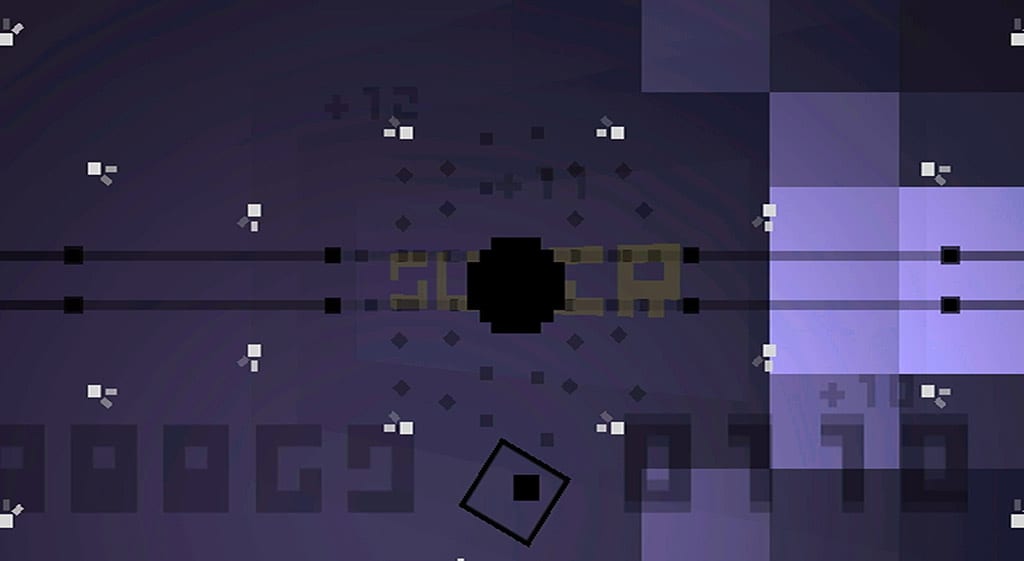 In VOID, you are collecting black beats as they fly across the screen from the left, and avoiding the white beats that come along with it. As you collect more and more of the black bits, the black circle that you control will grow and grow. It becomes harder to navigate away from the white beats as it grows though, and here’s where the game gets interesting. You have to press the A button to shrink your circle back down to starting level before you can be hit by the white pieces — if you’re hit by the white, you shrink as well, but you don’t get to keep the points you have acquired. You basically use shrinking as a way to deposit your points, but you will earn more points by being larger — there’s a lot of strategy involved in this, and in a way, it reminds me of Blast Works: Build, Trade and Destroy, in the sense that you’re trying to collect things to grow larger while balancing the need for more points with the need to avoid being hit by objects in the level.