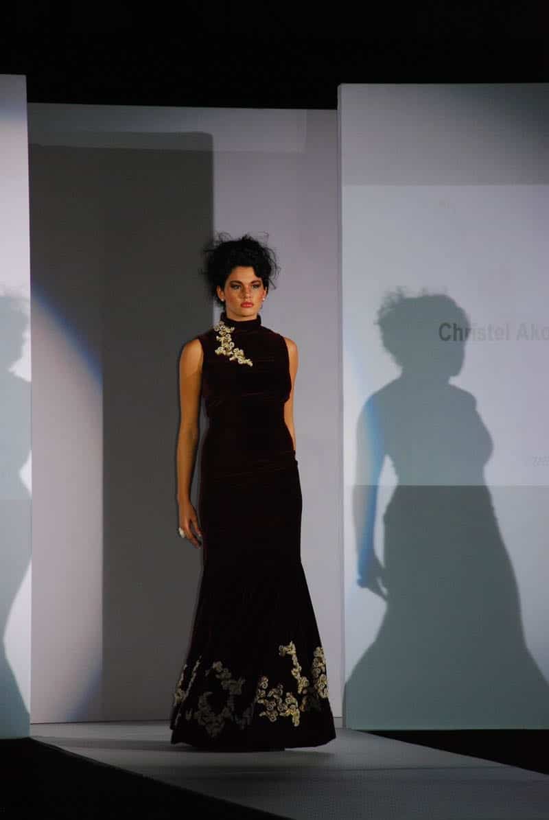 Akouri’s pieces were heavy-looking gowns with intricate beading and often open backs. The final gown, in particular, drew gasps from the audience when the model turned to reveal a very low-dipping back with a trail of beautiful beading and embroidery.
