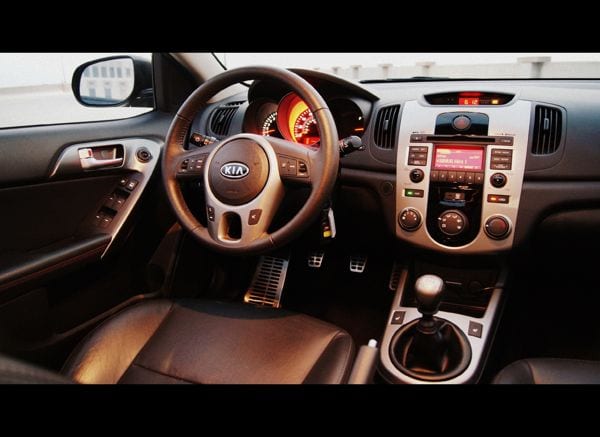 The Forte comes in three trim levels, the base LX, EX both of which share a 2.0L 156-hp with a 5-speed manual and an optional 4-speed automatic with a starting MSRP $13,695. We were lucky enough to score the SX model which came equipped with a 2.4L 173-hp with a standard 6-speed manual (an optional 5-speed automatic is available, too) MSRP of $17,495. Standard features with this trim level include heated power mirrors, a AM/FM/CD/MP3/SIRUS 6 speaker audio system, Bluetooth wireless, cruise control, remote entry, air conditioning, dual front and side impact airbags and abs. The optional SX leather package ($1000) includes heated seats and a windshield de-icer and power sunroof ($700) and topped the Forte out at $19,890. The only factory option that is not included at the moment is a navigation system, but a deal is in the works with Garmin.