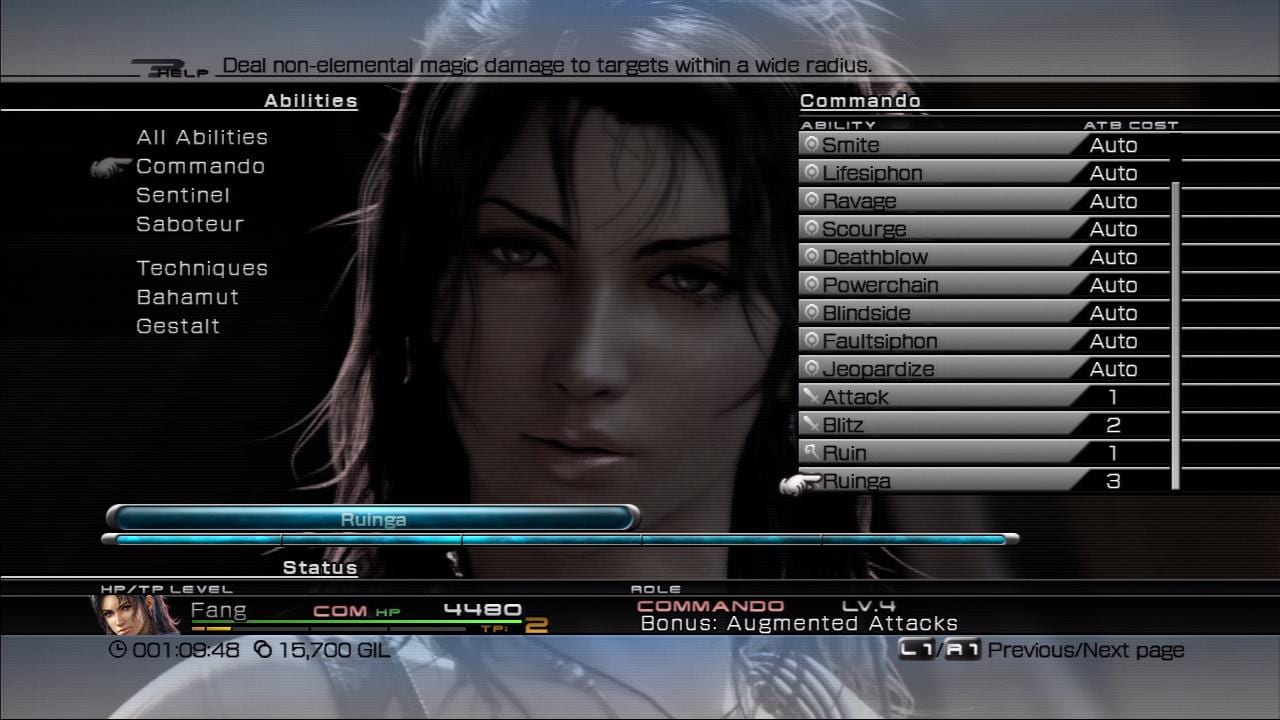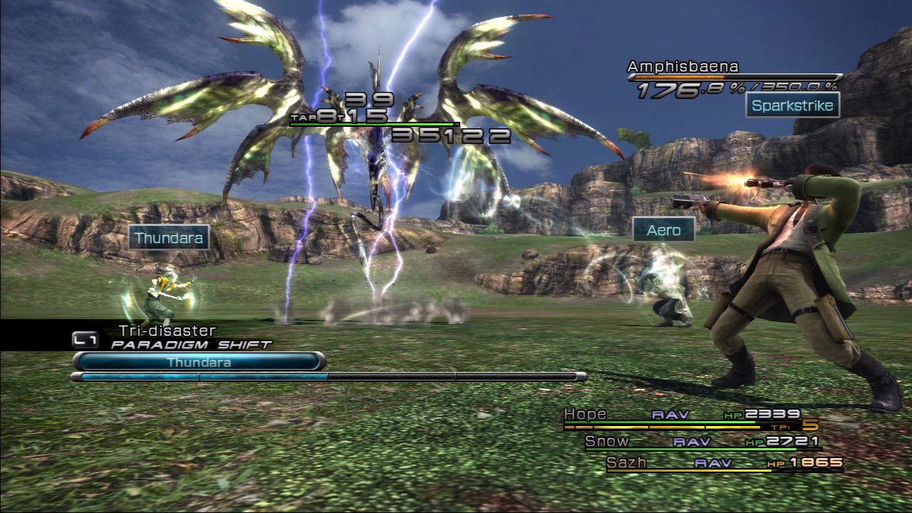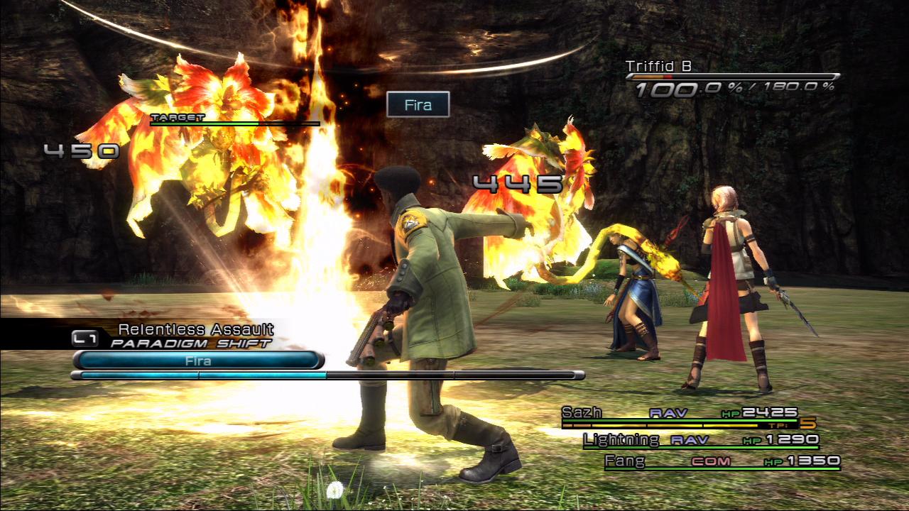 With those items out of the way, let’s discuss the battle system, which has seen a complete overhaul from past iterations of the franchise. Battles are not random, as you can see enemies on the map, and can either run from them or sneak up on them for preemptive strikes. About the only thing XIII has in common with the previous installment (other than seeing enemies on the map) is that you control one character at a time, but unlike XII, where things often felt boring and out of your hands while in combat, XIII is fast-paced to the point where you may react rather than think in certain situations. It’s not really turn-based in the traditional sense, as you have an Active Time Battle gauge that fills up and allows you to perform actions–simple ones take one ATB slot, while more powerful ones may take up to three. You can also stop the gauge and attack at any point by pressing triangle, so if you just need a quick hit or two and don’t want your gauge to fill up all the way, you can.