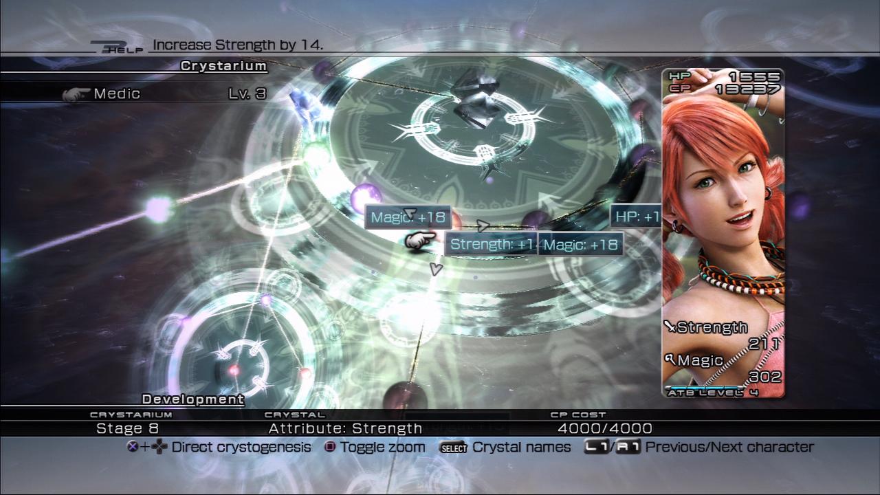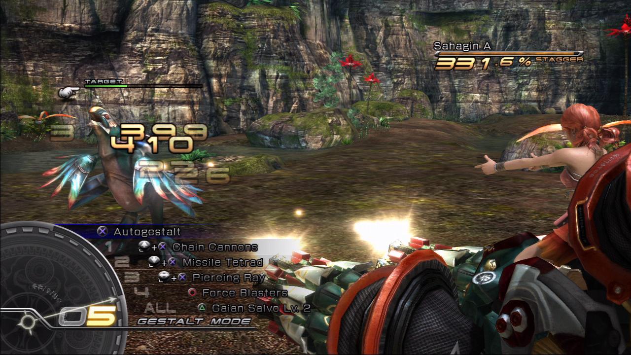 The second item is the Paradigm system. There are six roles in Final Fantasy XIII–think of them as a job system of sorts. The Commando, the Ravager, the Sentinel, the Saboteur, the Synergist, and the Medic make up the roles, and each has their own strengths and weaknesses. The Commando causes the most damage and helps to slow the decline of the stagger bar, but they do not raise the bar more than a fraction of a percent at a time. The Ravager does about half of the damage of the Commando, but the stagger bar jumps up the most from their attacks. The Sentinel takes a defensive stance to absorb attacks, and can only counterattack. The Saboteur uses status effect spells such as poison and slow, and can also reduce enemy defenses. The Synergist can cast haste, protect and other defensive spells on your team, and the Medic is capable of healing your group.