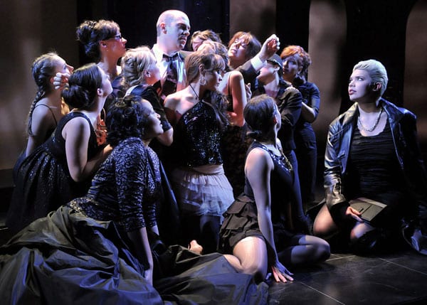 The tale follows one man, flailing filmmaker Guido Contini (Timothy John Smith) and the many women in his life: what they mean to him, and why he can’t seem to grow up. Avoiding a deadline, he retreats to a Venetian spa with his wife Luisa (Aimee Doherty), only to be pursued (not unwillingly) by former lover Carla (McCaela Donovan), as well as his demanding French producer (Maureen Keillor) and loathed critic Stephanie Necrophorus (Amy Jackson). In a bout of desperation, he summons the actress Claudia (Jennifer Ellis) to save his film, taking a chance that he will fall in love with her again. These five lovely ladies are only drops in the pool of women that surround him; the highlight of “Nine” is hearing a chorus of 15 of some of Boston’s most established actresses, as well as many up-and-coming ones, sing Maury Yeston’s mellifluous score. Timothy John Smith and the young actor who plays him as a child shine as well, but what makes Nine unique is the chorus.
