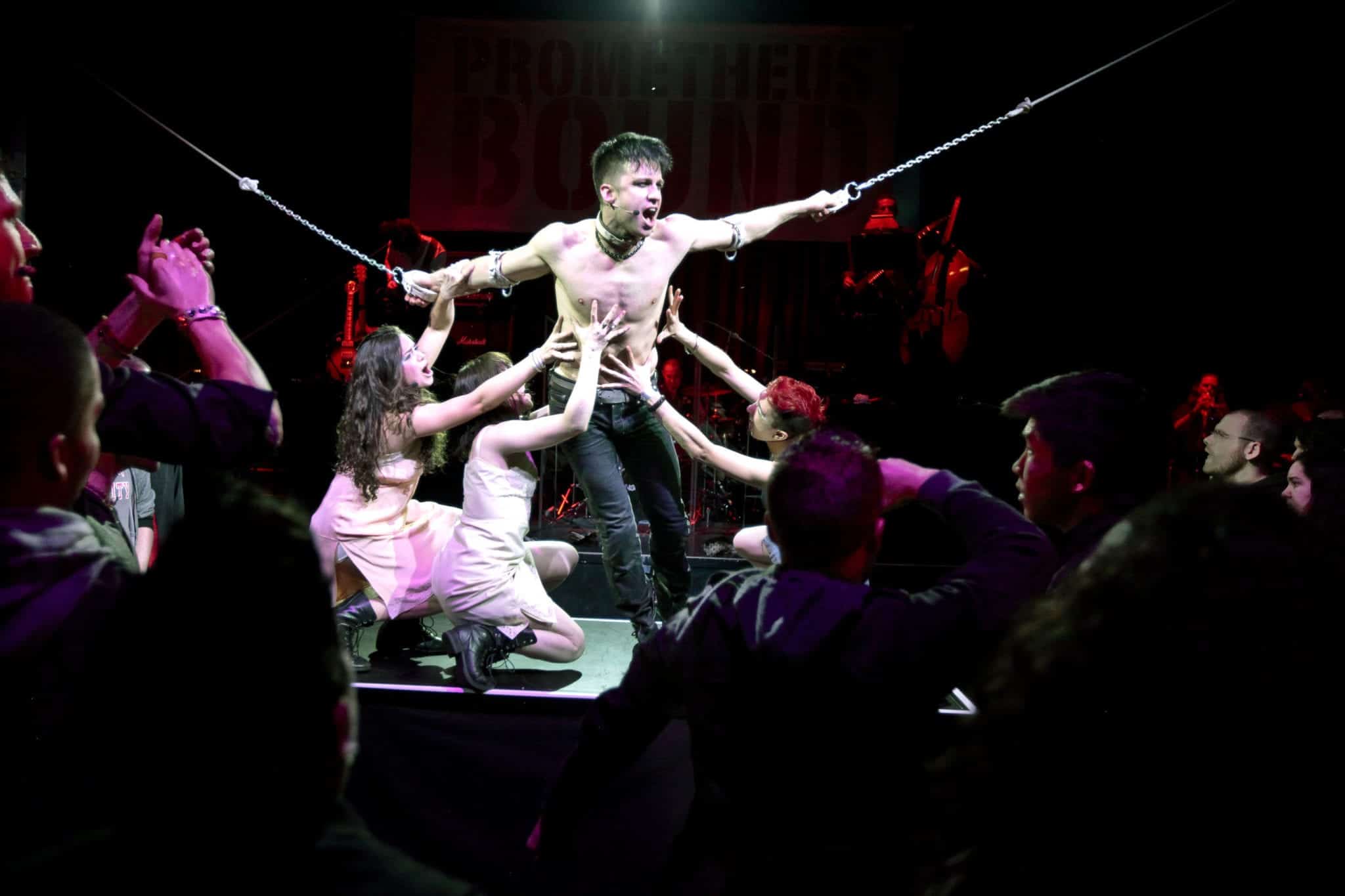 Paulus mounts “Prometheus” at OBERON, putting an 8-piece band complete with horns, strings, woodwinds and synth in support of a central guitar/drums/bass combo on the venue’s small stage, opposite its bar (which remains open). The dance floor is opened up so audience members can mingle with the show’s extras and a phalanx of small tables rings the floor’s perimeter. The play’s punky gods, Titans and “Daughters of the Aether” mostly perform on a rig wheeled out into the dance-floor’s center, and from OBERON’s balconies.