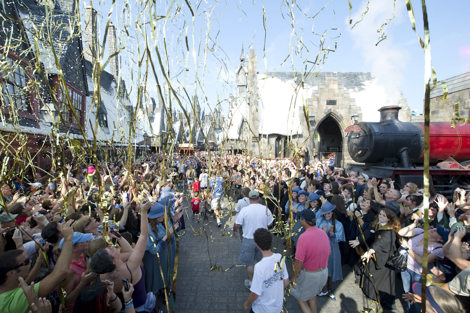 Exactly one year after it first opened, on June 18, 2010, the celebration this year included “snow” confetti and gold streamers falling in the streets of Hogsmeade. In addition, Butterbeer, cauldron cakes and chocolate frogs were served to guests.