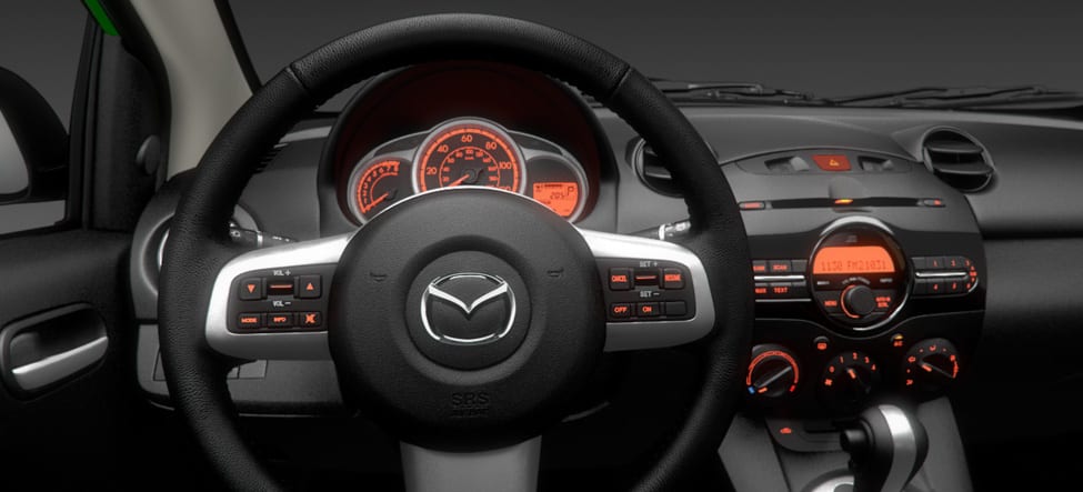 The Mazda 2 is available in a Sport or Touring trim, MSRP starts at $14,180. Our 2 Touring version stickered in at $17,480. A uniform color of black with red accents on the upgraded Touring cloth seats did not appear cheap but of good quality making the cabin seem more spacious then the exterior leads you to believe. Your head won’t hit the ceiling and if you just so happen to be stuck in the backseat, you won’t feel as if you are stuffed in a clown car. The amount of space is generous for such a compact vehicle. The optional, generic arm rest ($170) should be included with the Touring package. Where else would your elbow go since there is no center console at arm level reach? Instead, there are three cup holder/stuff collecting compartments to place whatever your heart desires. The rear seat splits and folds flat, providing an ample 28.3 cubic feet of cargo space for large items. And thanks to the hatchback opening and width, there is still plenty of space to stash groceries or whatever else you carry with you. Round is the shape of choice from the instrument cluster, radio/a/c pod, leather-wrapped steering wheel with controls for audio/cruise much like the uniform color of the upholstery to make the interior cohesive while avoiding a cheap appearance.