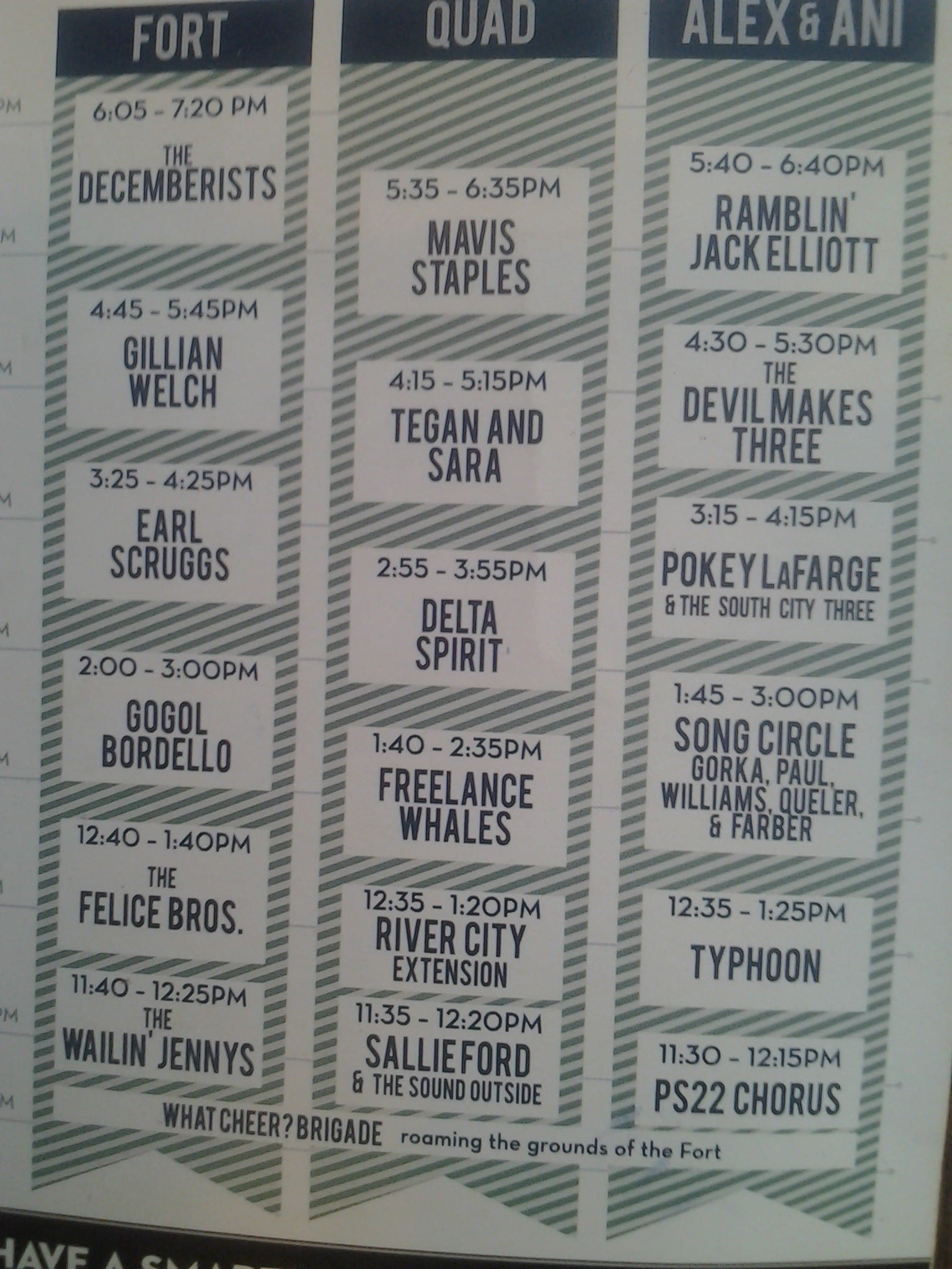 The last acts at the festival start between 5:30PM and 6:00PM. The last Peter Pan leaves the city of Newport at 7:00PM. Please note that while the posted schedule lists the last water taxi leaving Fort Adams Park at 6:00PM, during the folk and jazz festivals, boats run until the bitter end. Still, I needed to play it safe. This meant that I was only going to catch a couple of opening songs from one of the day’s three closers: Indie folk rock stars, The Decembrists, soul legend Mavis Staples, or Woody Guthrie disciple Ramblin’ Jack Elliot.