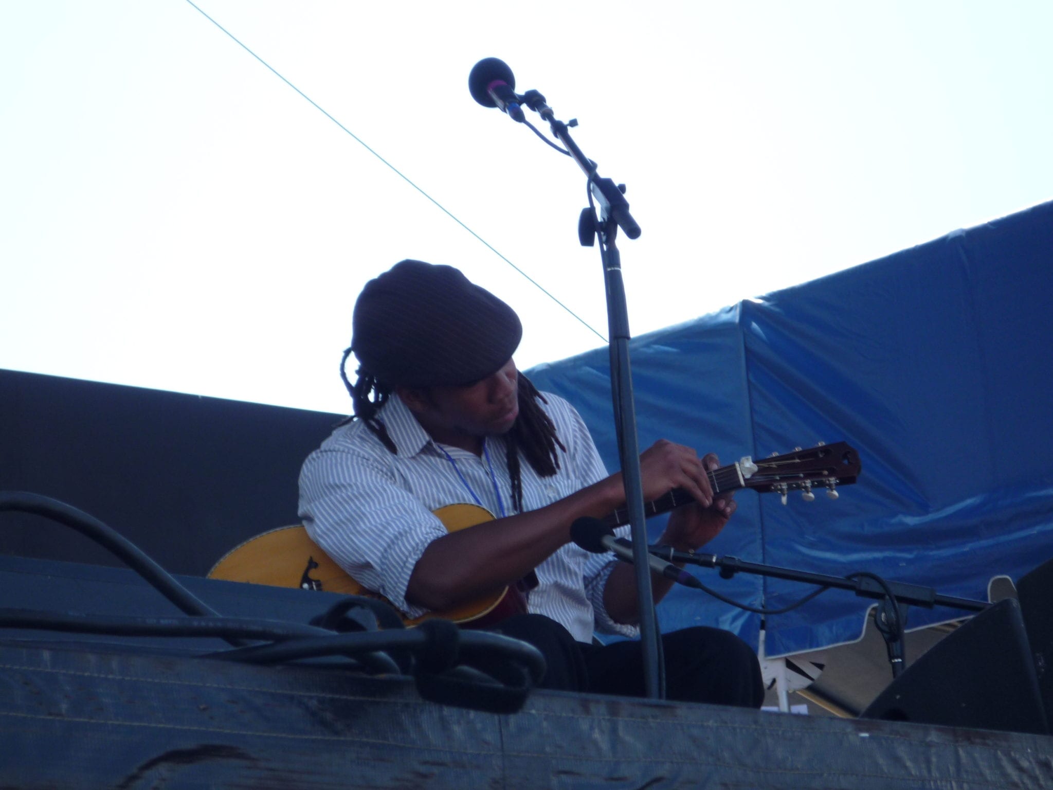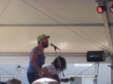 In fairness to the acts who played over the next hour, no one was going to top the Drops for me. Their bridging of traditions, their openness and their energy just seemed to embody the best of the festival. There was a grin beneath my brim as I trotted over to the Alex & Ani stage, on which I saw a dude in a neon yellow trucker cap, a sleeveless tee and bluejeans, offering his gentle tenor into a mic. A guitarist was seated to his left, rocking the grundge look, a mop of long whipped hair rendering the rest of his head completely invisible. These were the Cave Singers, with whom I was not familiar. As usual, I had a hell of time penetrating the tent crowd to get a half-decent photo and I was repeatedly shooed away from the perimeters by the perimeter cops.