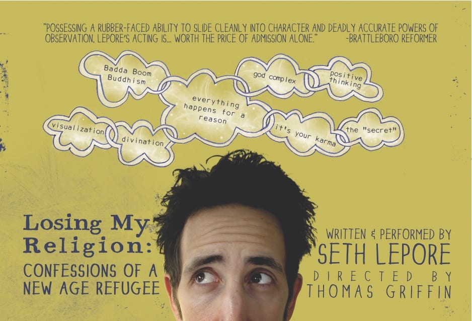 Seth Lepore is a performance artist and member of the C3 arts collective in Northampton, Mass. He’s also a “recovering Catholic” and a “New Age Refugee.” His latest one-man show, “Losing My Religion,” takes a humorous look at the commercialization of ism-based spirituality, alternative healing and self help movements. After successful runs in a number of small theaters and fringe festivals, it plays at the Arlington Center for the Arts, November 11-12.