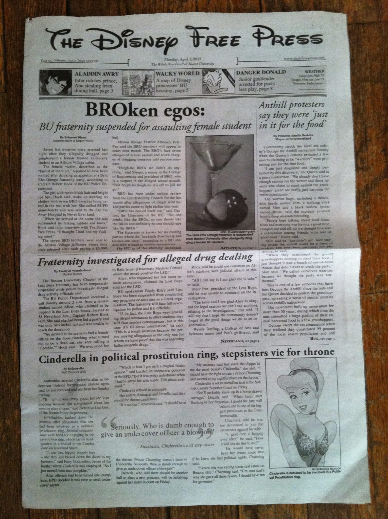 Although the majority of the articles in the issue were in some way offensive, the worst of the bunch was titled “BROken egos: BU fraternity suspended for assaulting female student.” The article talks about the seven dwarfs “gangbanging” Snow White after putting date rape drugs in her appletini. The article uses triggering language and graphic description. This is particularly awful because it could be true.
