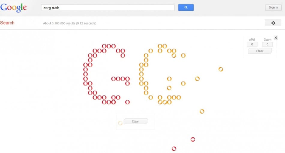 Google the words “Zerg rush,” and after a few seconds you will see a group of Os start to descend on your search results and start eating them up. Each search result has a small health bar, so if you want to save them, you’ll need to attack the Os by quickly clicking on them until they die.