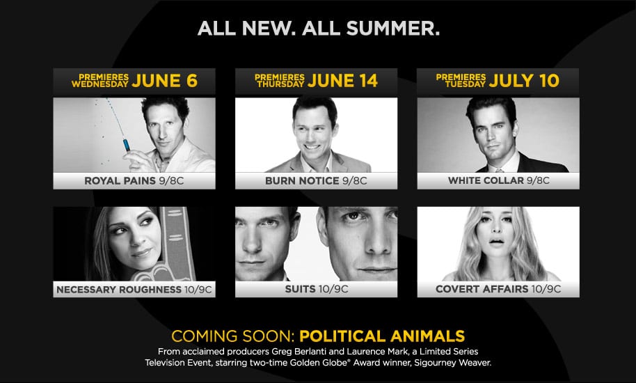 USA Network is kicking off a scorching summer of season premieres this week. Yesterday, “Royal Pains” and Necessary Roughness premiered last night, and both “Suits” and “Burn Notice” launch next Thursday, June 14. Plus, “Cover Affairs” and “White Collar” will be make their new season debuts later this summer, Tuesday, July 10.