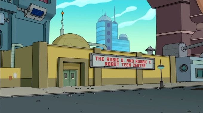 When it becomes obvious that the kid is Bender’s offspring, it’s revealed that he has no idea how robot reproduction works.  So the gang takes Bender to the Rosie D. and Robbie T. Robot Teen Center, where he and a bunch of robotic teenagers watch the robotic equivalent of a sexual education tape.  The kind of crazy thing is that, in a weird “Futurama” way, the tape makes sense!  Of course in the future robots would be designed to reproduce on their own, alleviating the need for human robot production.  Genius!