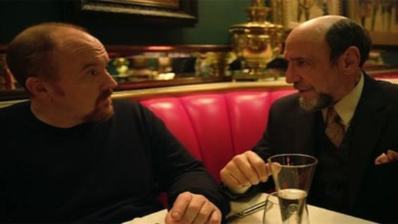 Louie, armed with sarcasm and impatience, flails his arms in the air. “Can somebody help me?!” Reluctantly, one employee volunteers. When Louie turns around ironically thanking him, the employee flips him the bird behind his head. To be fair, this salesman is atrocious. Louie asks plainly, does this play Blu-Rays and DVDs. And dude just lifts the box and reads the specs. This is a pet-peeve of any customer—we could have read the box ourselves, dummy. Even so, like when the episode began with him as the villain sucking the life force out of the soothing violin solo, he set this interaction up to be contentious. Therefore, when he takes a phone call from his uncle and ignores the salesman, his comeuppance was deserved. Eloquent Uncle Excelsior—who we later see is played by Academy Award winner F. Murray Abraham, not reprising his role as a swinger husband from New Jersey from season 2’s finale—calls to set up a lunch at the swanky Russian Tea Room. And as Louie hangs up, he turns around and falls on his face. The vengeful salesperson stuck a box behind his feet to initiate the tumble.