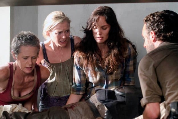 Carol and Lori, meanwhile, are doing their best to tend to Hershel’s leg, but it’s not going to work out too well unless they can get their hands on antibiotics and sterile gauze. And then if he survives, they’ll need crutches. Or a peg leg, I guess, though that seems like a difficult thing to make properly. Carol points out that Lori must be worried about delivering her baby in a medically deficient situation like this. Lori lies and says she isn’t, but we all know that’s not true.