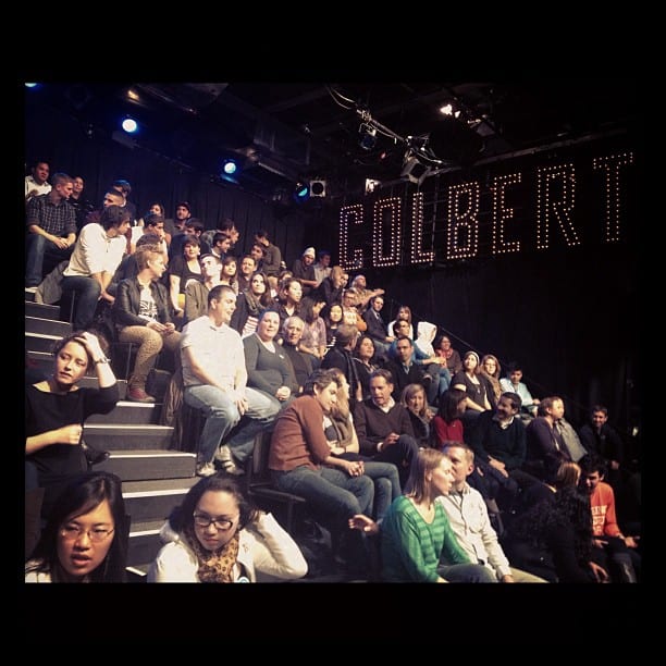 But that wasn’t quite it, either. Finally ushered into the, gratefully, heated holding room where the tried and true years-old “best of” compilation played on a corner television (which at this point I’d seen twice, never mind the times I’d watched these episodes alone), it was hard not to notice just how engaged everyone was. They laughed loud and hard at every joke, nearly roared when the Colbert interns demanded we send up a trial-run cheer, and fidgeted like mad when the first hints went out that we’d be going in soon. If this was any indication, it was going to be a good show.