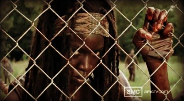 After the credits, we pick up where we left off with Rick and Michonne having a stare-off through the prison fence. Her walker camoflauge isn’t enough to mask her fresh gunshot wound, and the walkers soon turn on her. She defends herself, limping all the while, and Carl comes down to ask Rick if they should help her. Thankfully, he shoots the walkers that are about to eat an almost-unconscious Michonne before he gets an answer. He and Rick take her and the basket of supplies inside.