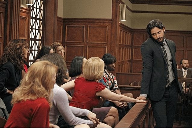 The dopey and bro-tastic Brad turns out to be a far more formidable foe in court, relying on his handsome looks and chiseled body to woo a jury of all women (and a seemingly gay judge to boot). He sexualizes his entire defense by showing off his butt, making pollution sound sexy, and playing a video for the jurors that shows him scantily clad and enjoying a sunny day at the tainted pond in question. Marshall almost loses hope but triumphs in the end, using Brad’s strategy against him by making him reveal his rash-covered chest after he swam in the polluted pond. When the verdict comes in, the jury rules in Marshall’s favor but only penalizes the defense $25,000 in damages rather than the $25 million that his firm was hoping for. We’ll have to tune in next week to find out what repercussions this shortcoming has for Marshall’s employment at the firm.