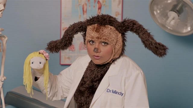 The episode opens not with the usual voiceover, but with “Women’s Health Minute With Mindy,” a really terrible, cheesy cab video Mindy made and is now proudly showing off to Danny as they grab a taxi together. Mindy’s dressed as a dog for who knows what reason (though she cites Rolf the Muppet as an inspiration), and is using a sock puppet as a costar. Clearly the target market for women’s health shorts in cabs hasn’t moved beyond Sesame Street. While it’s mildly amusing to see Mindy dressed as a dog give gynecological advice and sing, I’m with Danny and their cab driver on this one: not a good idea at all.