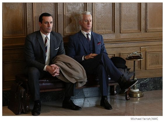 Then, he has his moment of diabolical genius. Rig the system. Combine the ingenuities of SCDP and CGC to create a new superpower that Chevy can’t deny. Ted isn’t receptive at first, but then the idea of dipping into each other’s pool of creativity sounds sexy, and they stay up that night prepping. The next morning both Jim Cutler and Roger Sterling look like proud, skeptical papas hoping their boys are just crazy enough that they could make it work. And it does, despite all laws of fairness.