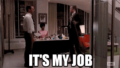For instance, how would you explain Ken Cosgrove tap dancing, rapping “It’s My Job” (gif below) for Don as he bitches about the hoops he has the jump through for Chevy (if that’s the audience stand-in, I’m frankly sickened by myself. Our expectations are way too high, and we nearly killed Kenny! Wait, different show). But I don’t blame him for feeling like a guy whose being asked to perform like a court jester for the client. They tell him they might not buy an ad for three years and yet they are exhausting themselves creatively and asking him to entertain them in the meantime. They’re toying with Ken because he’ll do just about anything to please them and his dance routine for Don is a reminder that he exerts the same kind of impossible pressure on his subordinates. Ken’s tapping feet are the answer to boss man Draper’s incessant “What have you got for me?”