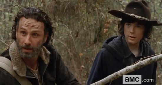 Rick teaches Carl about trapping rabbits and tying slipknots, which is a neat throwback to Shane teaching Carl about knots way back when. All this talk about trapping animals both in this scene and in another Hershel flashback had me nervous; turns out it was great foreshadowing for their arrival in Terminus.