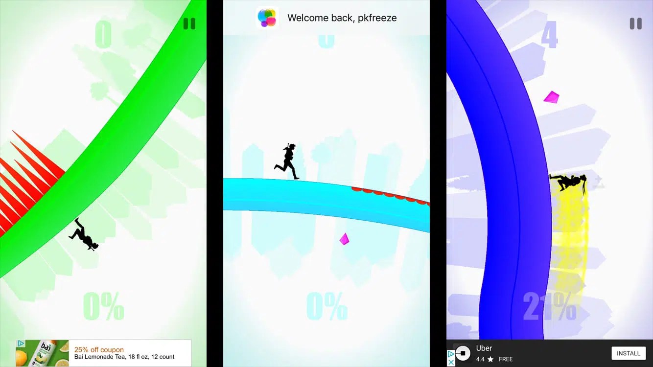 Simple, yet challenging to master, Flo is an arcade game has you playing with gravity in an effort to outrun a miasma of darkness chasing after you. Simply tap to travel below the horizon line to pick up speed as you roll down or tap again and travel above it to go faster when rolling up. You will need to go back and forth wisely to ensure you get enough speed to avoid slowing down on the slopes you’ll run into.