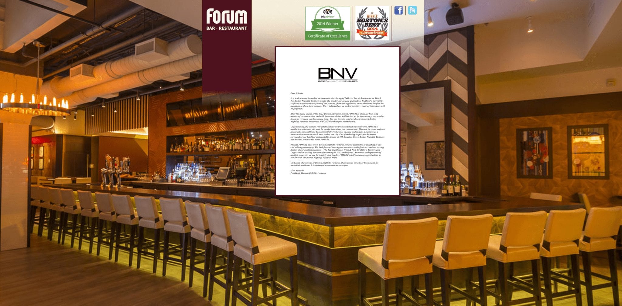 Back Bay’s Forum Restaurant Closing Down Georgeanne Oliver Lifestyle February 25, 2015Forum Bar and Restaurant, a Back Bay restaurant damaged during the 2013 Boston Marathon Bombings, is closing it doors, as...